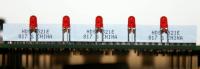 The five indicators LEDs are soldered into the DS1-DS5 positions above the 7-segment displays. Be careful to orient the LEDs properly into the holes. The SHORTER leg of the LED is inserted into the SQUARE pad on the board. If an LED doesn't work when you power up the board, then you probably inserted it backwards. Look at the picture at left to see the proper height at which to solder the LEDs. Don't worry if you don't get it perfect since the overlay will hide it. You can always go back and readjust the legs with the soldering iron if they are installed too tall or too short. After you are happy with their positions, clip the legs to a shorter length.